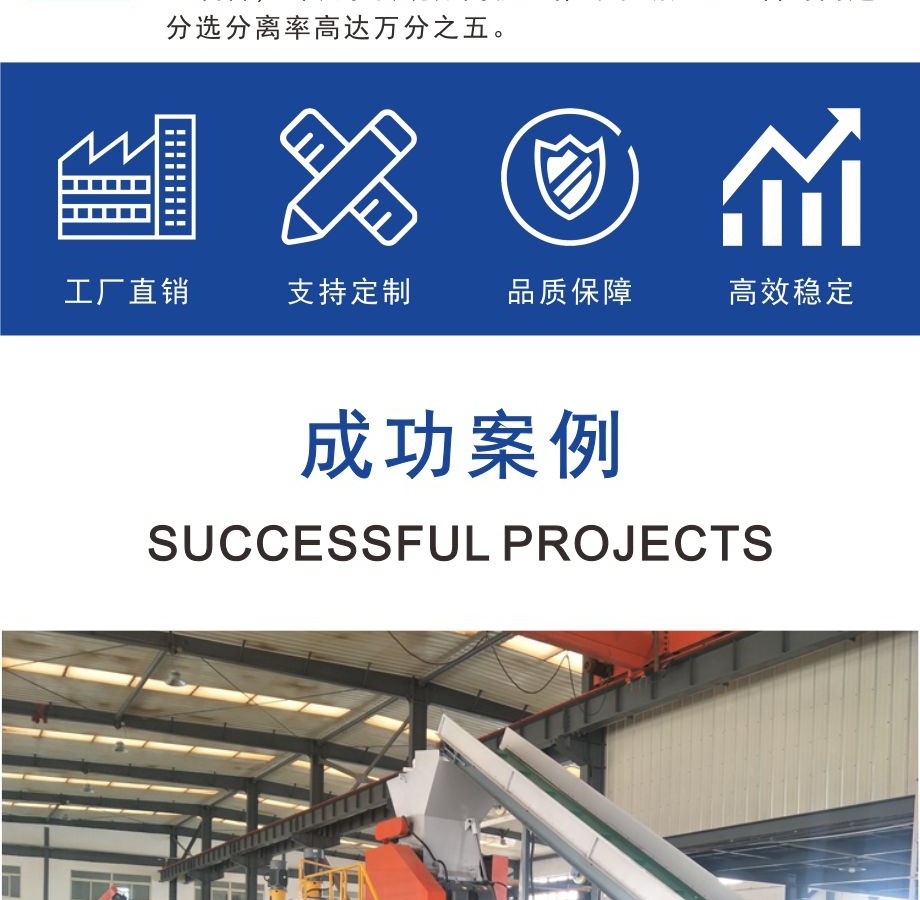 一次性塑料輸液瓶(袋)回收加工生產(chǎn)線主要用于醫(yī)用可回收塑料(輸液瓶/輸液袋)的回收分類、清洗加工、再生造粒等的加工處理。醫(yī)用可回收塑料是指:未被病人血液、體液、排泄物污染的一次性塑料器具(包含塑料輸液袋、輸液瓶類,但不包括輸液管及注射器等)。本生產(chǎn)線主要分為:1、原料預選及粉碎,2、殘液及污漬收集,3、清洗脫水,4、材質(zhì)分選,共四步工序,整條生產(chǎn)線自動化程度高,一個投料入口和三個成品出口(三種不同材質(zhì)的成品出口),除入口及出口處需要人工投料和裝袋外,生產(chǎn)加工環(huán)節(jié)0人工介入。生產(chǎn)線全密封防水設(shè)計,殘液收集和清洗環(huán)節(jié)均采用獨立的管道收集口,可直接與后端相應(yīng)的污水循環(huán)處理設(shè)備管口對接,以大限度的確保生產(chǎn)作業(yè)現(xiàn)場環(huán)境干凈、整潔(應(yīng)對企業(yè)整體項目的環(huán)評審批等行政手續(xù)有明顯優(yōu)勢)。